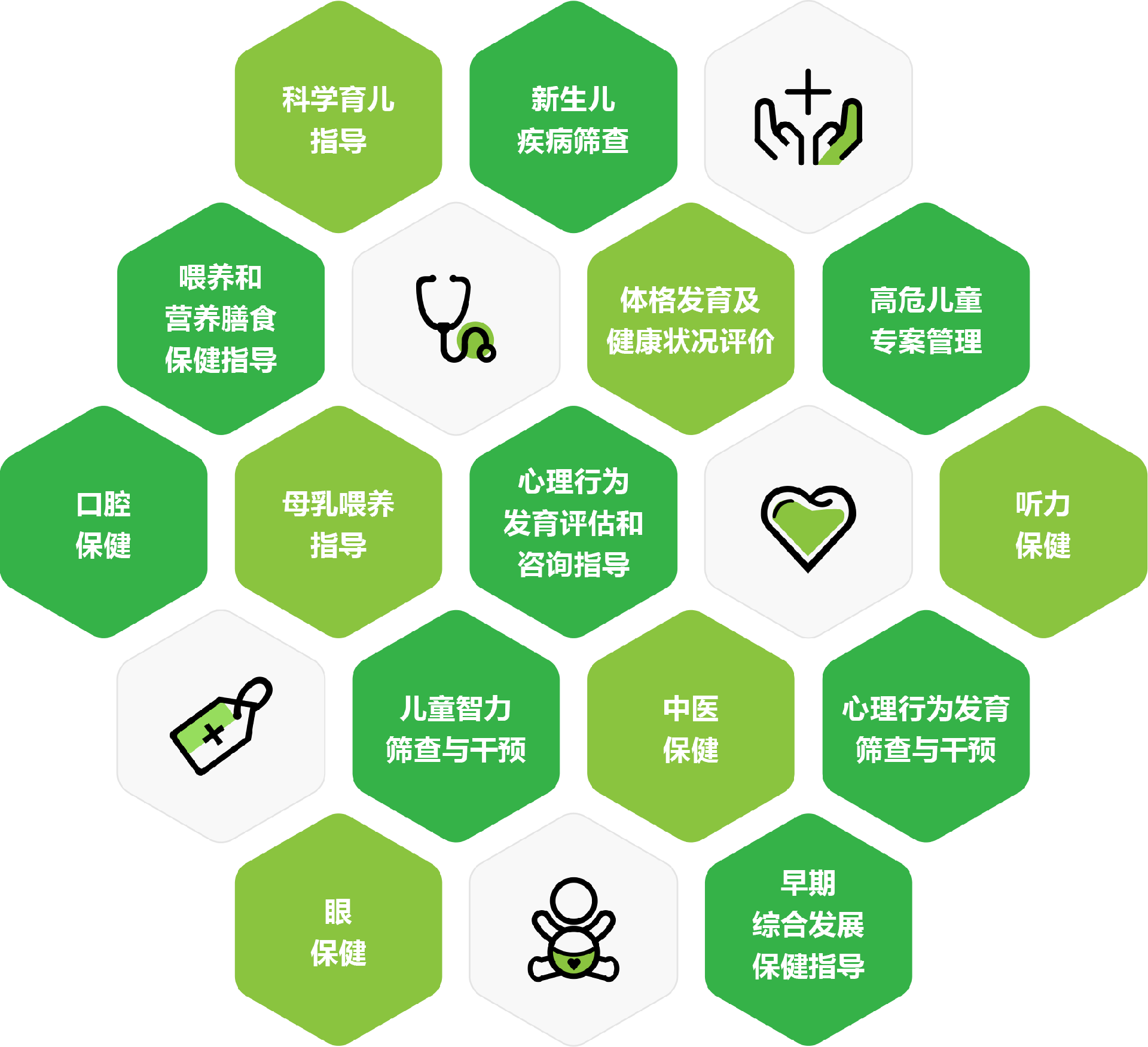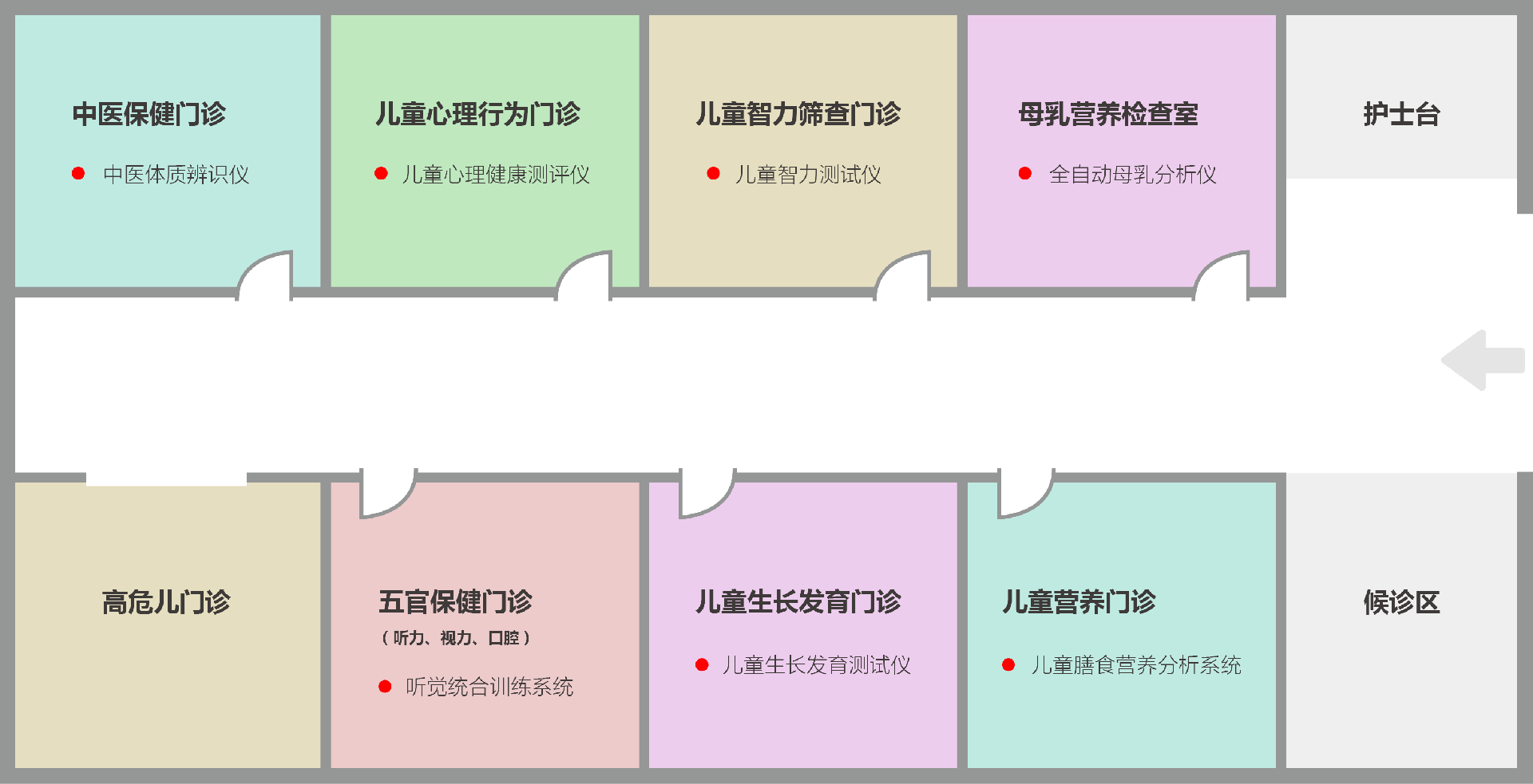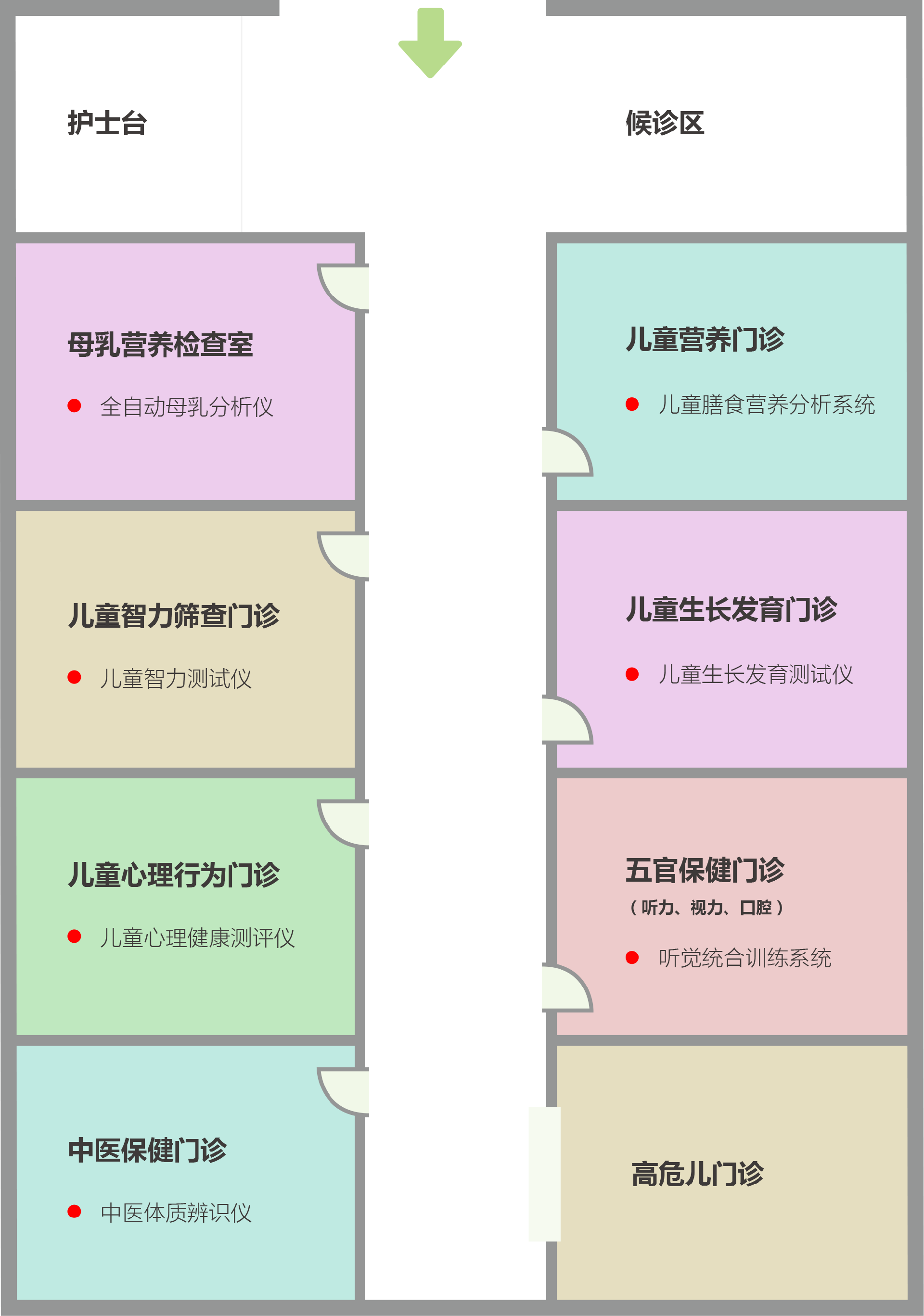 按照区县级妇幼保健院、综合医院的规模、业务开展等实际情况,打造儿保科标准化建设方案,为医院提供一体化服务解决方案(重点开设下图中的8个门诊),为儿童提供安全、有效、便捷、温馨的健康服务,全力维护儿童健康成长。