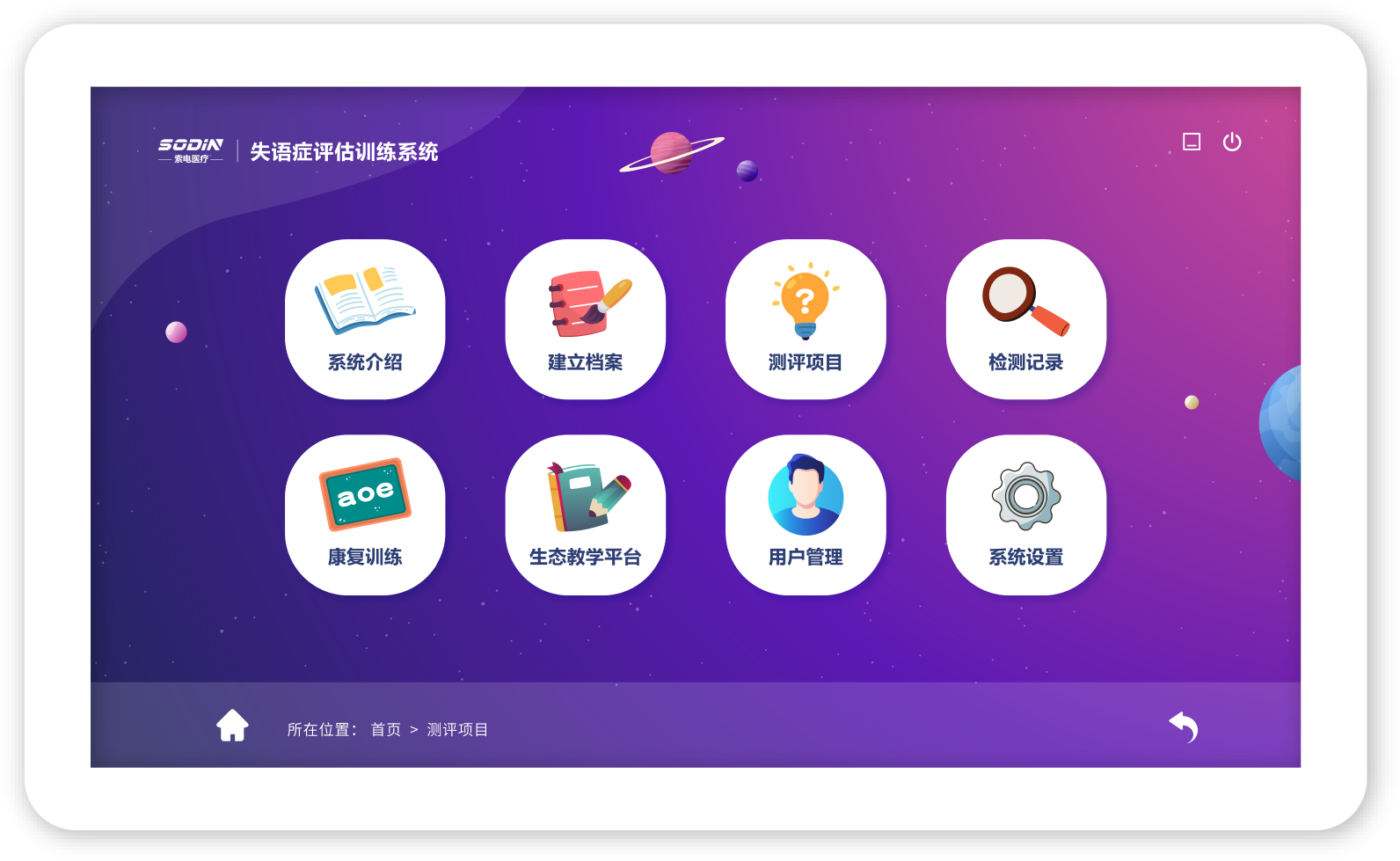 系统用于对失语患者进行评估与训练,失语症评估主要分为:汉语失语症成套测验(ABC)和中国康复研究中心汉语标准失语症检查(CRRC)。 由我国高素荣教授与美国洛杉矶加州大学瑞德(Reed)神经病学研究所著名临床失语学家D.Frank Benson教授参考了WAB及BDAE,并结合我们的临床经验,将简易临床失语检查法修改为简易的汉语失语检查法,在国内广泛应用。 中国康复研究中心汉语标准失语症检查(CRRC)于1990年编制完成,引用了发达国家失语症检查法的理论和框架,在语句的选用方面严格依据汉语习惯和规则。