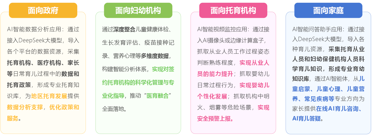 该 AI 应用场景平台以 DeepSeek 大模型为依托,面向政府、妇幼保健、机构、家庭四大主体,通过整合多源数据与智能技术,提供数据分析、机构管理、视频监控、在线咨询等服务,推动托育行业发展。