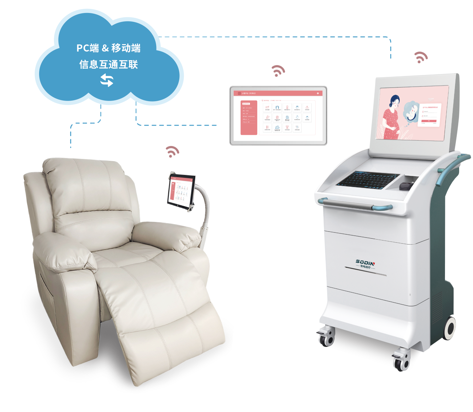 孕产妇身心健康管理系统是索电医疗设计研发的一款高端系统,主要解决孕产妇的心理及生理问题,避免因孕期身心健康不良对孕妇和胎儿造成的一系列的影响。通过人工智能技术、智能化信息集成与数据分析、患者管理与追踪、云平台大数据等技术,从门诊至临床、院内至院外、线上至线下等多方面,为医院提供全方位、多层次、多维度的孕产妇身心健康整体解决办法,是孕产期身心健康诊疗干预的新标准、新规范。