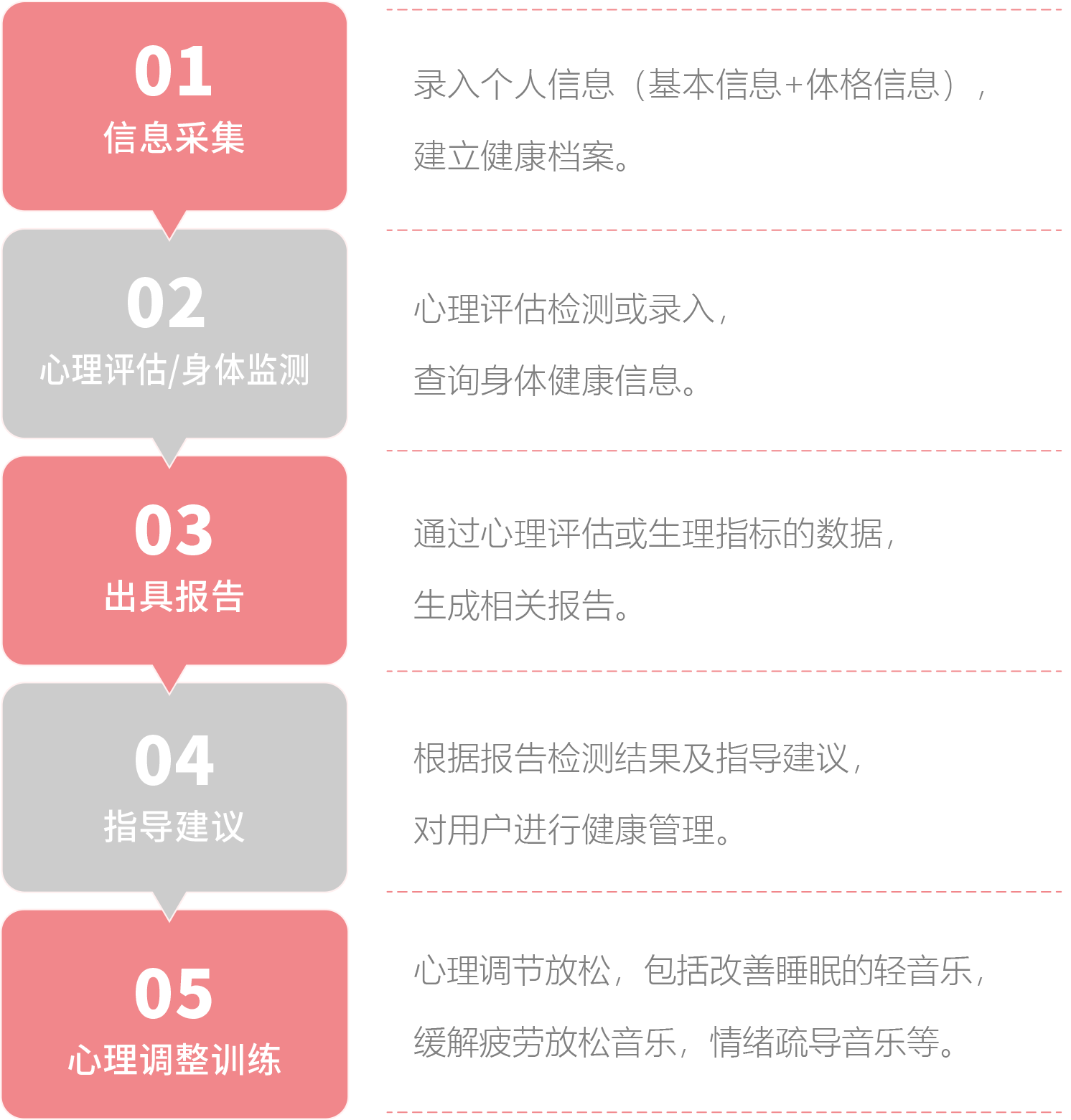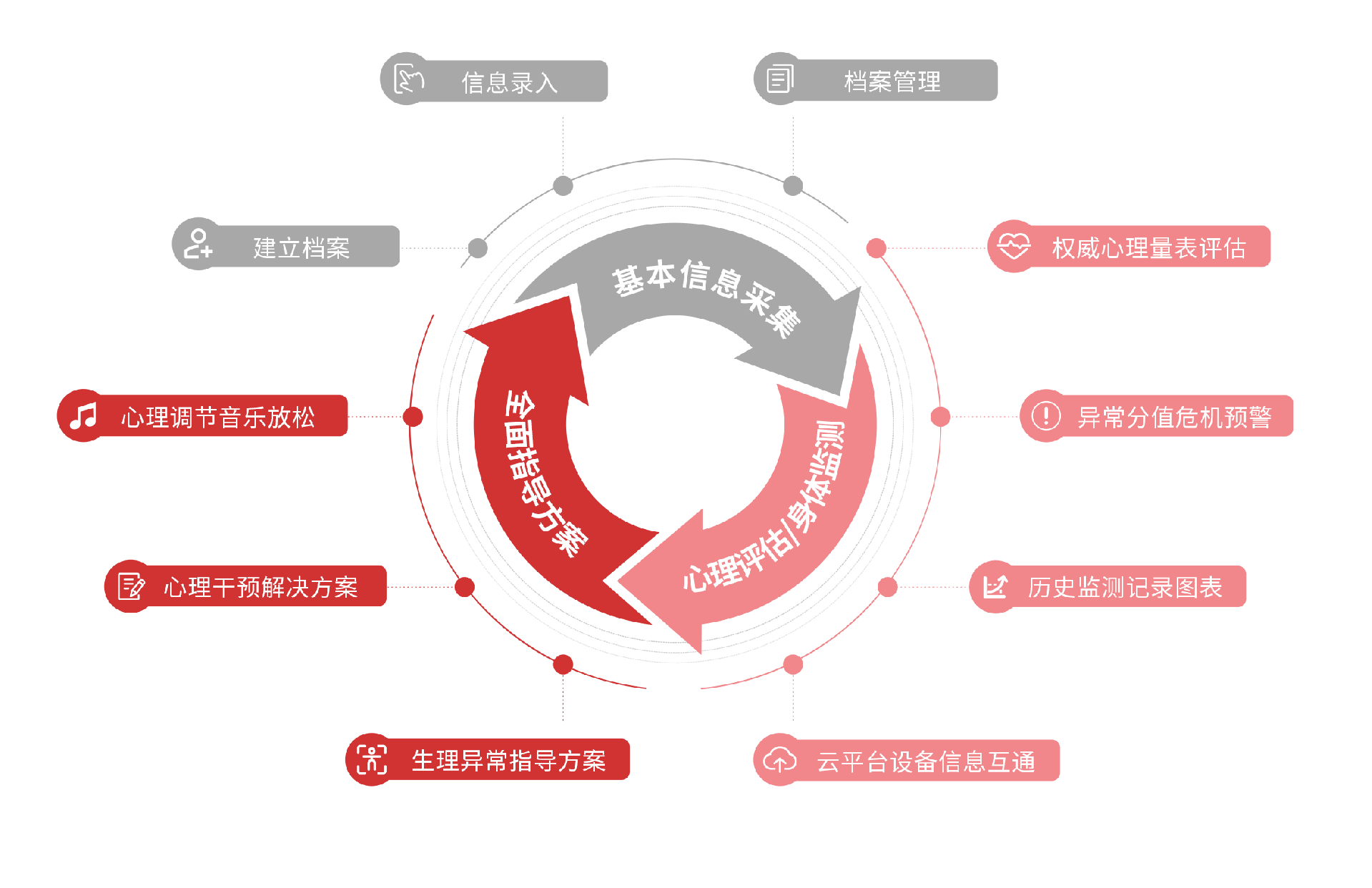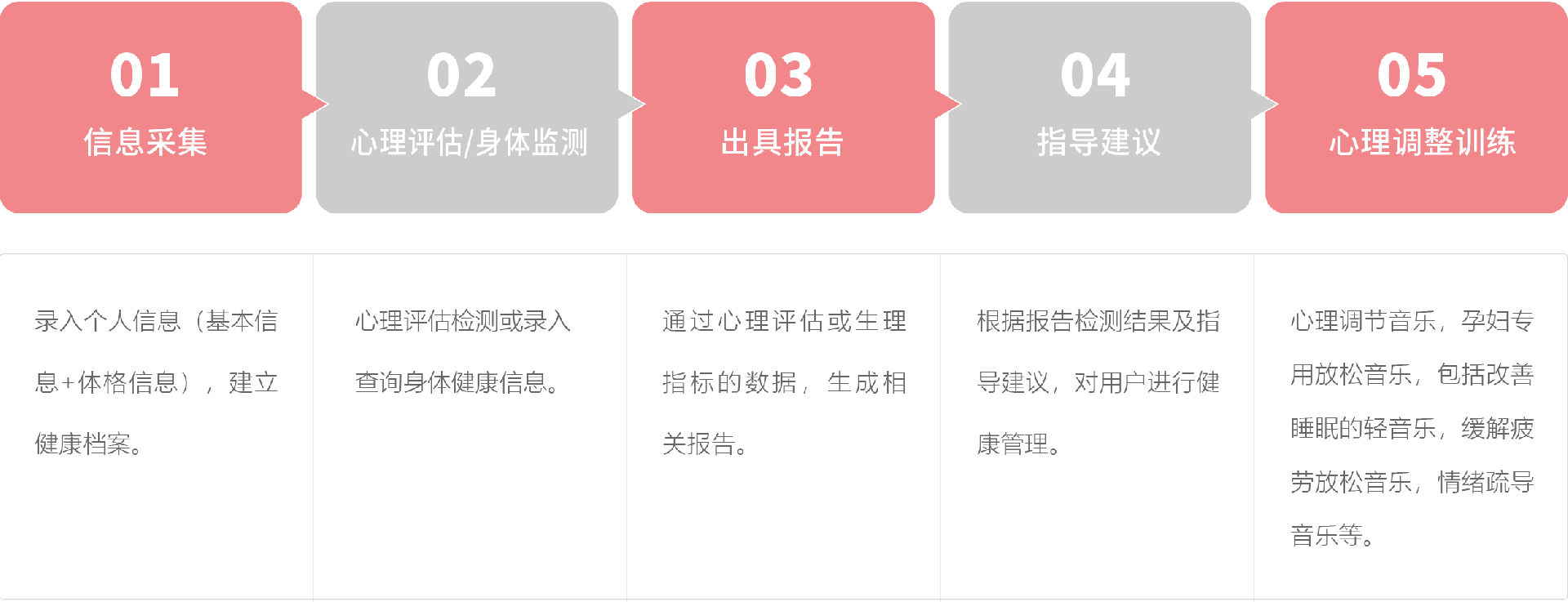 系统依据现代医学理论体系,将临床医学、心理学、妇产科学等与云计算和互联网+完美结合, 对孕产妇从备孕期、孕期、产后多个阶段进行全面的心理诊断评估,并自动划分为轻度预警、中度预警、重度预警等几种类型; 通通过沉浸式减压放松模式,智能一体化训练方案对孕产妇心理问题进行综合性干预。